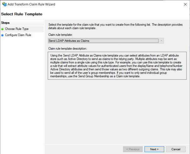 Click the Claim rule template drop-down and select Send LDAP Attributes as Claims. Click Next.