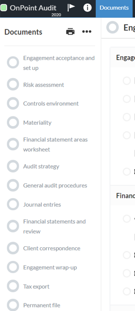 To see all documents available in OnPoint Audit, select More Actions (...) Elementos ocultos De lo contrario, sólo serán visibles los documentos y fases aplicables a su tipo de encargo.